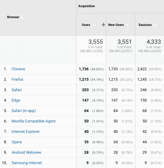 Aquí, puede ver que los visitantes de mi sitio utilizan abrumadoramente Chrome y Firefox, lo que significa que el 83% de mis visitantes se beneficiarían si usara WebP.