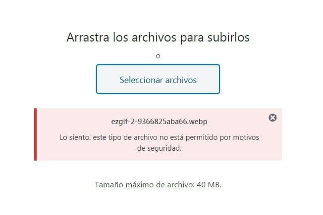Aquí hay otro obstáculo cuando se trata de usar WebP: WordPress no lo admite. Si bien WordPress es compatible con los formatos de archivo de imagen más populares, incluidos JPEG, PNG, GIF e ICO, todavía debe agregar WebP a esa lista. Esto significa que no puede simplemente subir y cargar un archivo WebP a su biblioteca de medios de WordPress porque obtendrá este error de seguridad:
