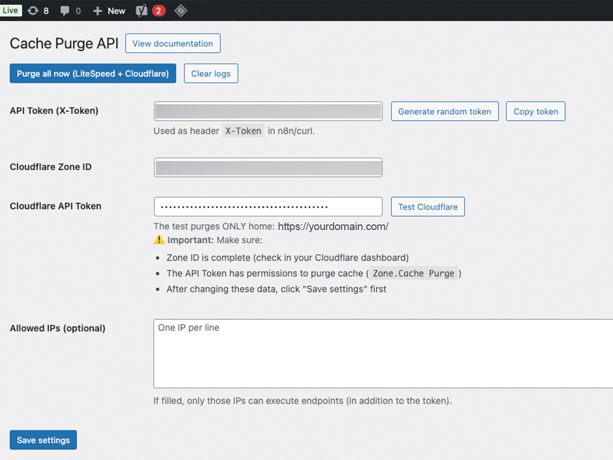 Purge avanzado de caché para WordPress vía API REST Compatible con LiteSpeed Cache y Cloudflare. Ideal para n8n, automatizaciones, WooCommerce, CI/CD y flujos avanzados.